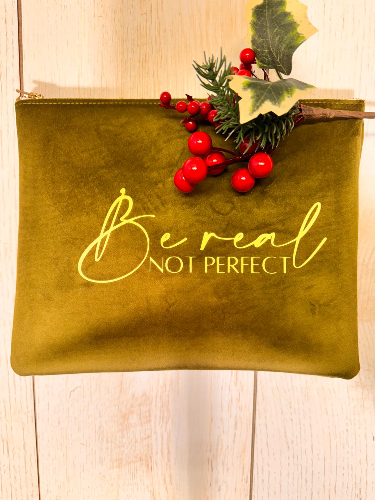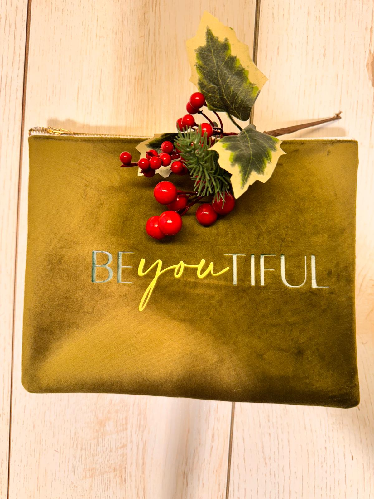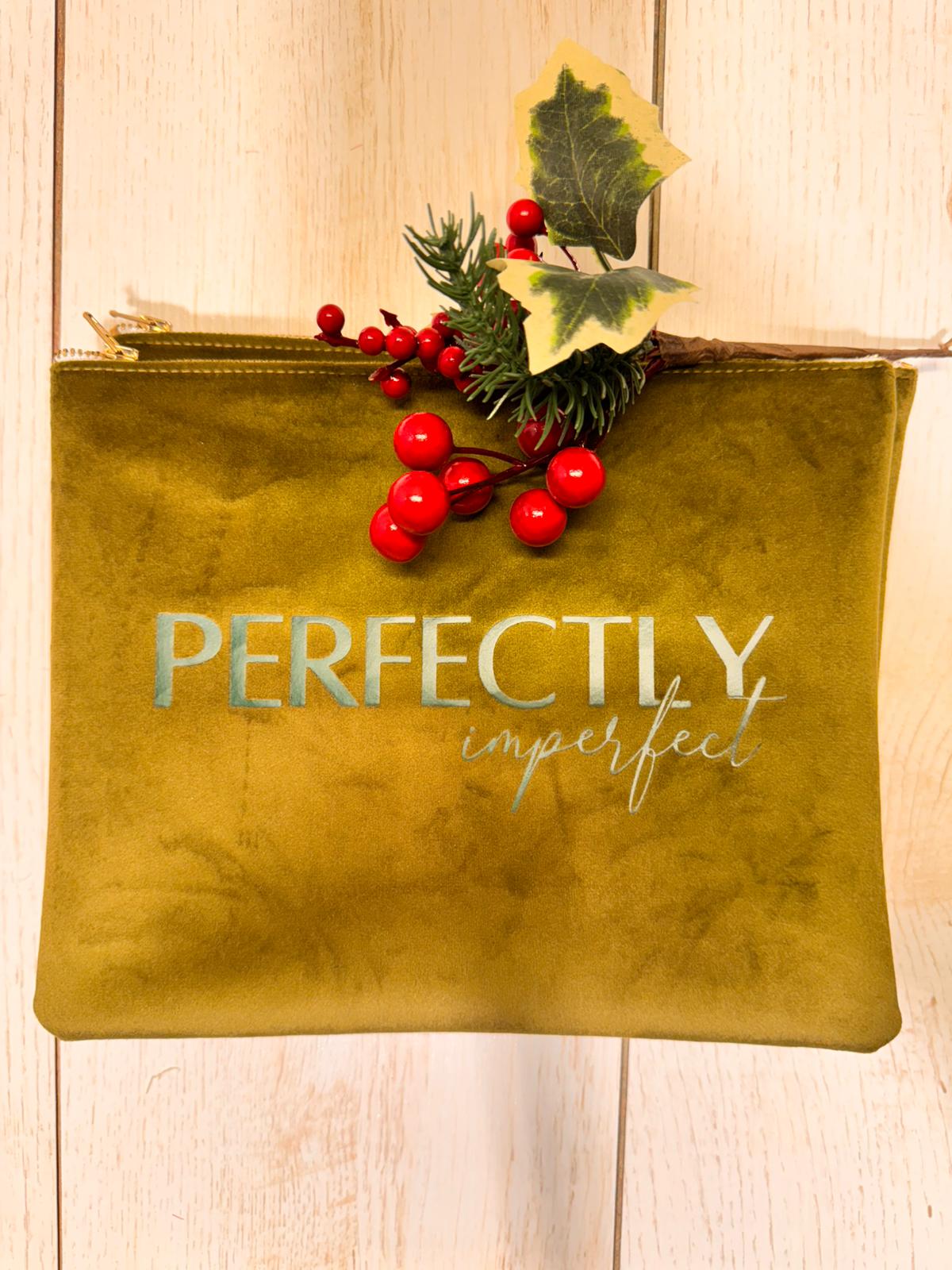 Borsetta in velluto color muschio, interno in ecopelle con stampa color verde froesta/oro. made in italy. misura 25x20 cerniera oro. 3 varianti di testo