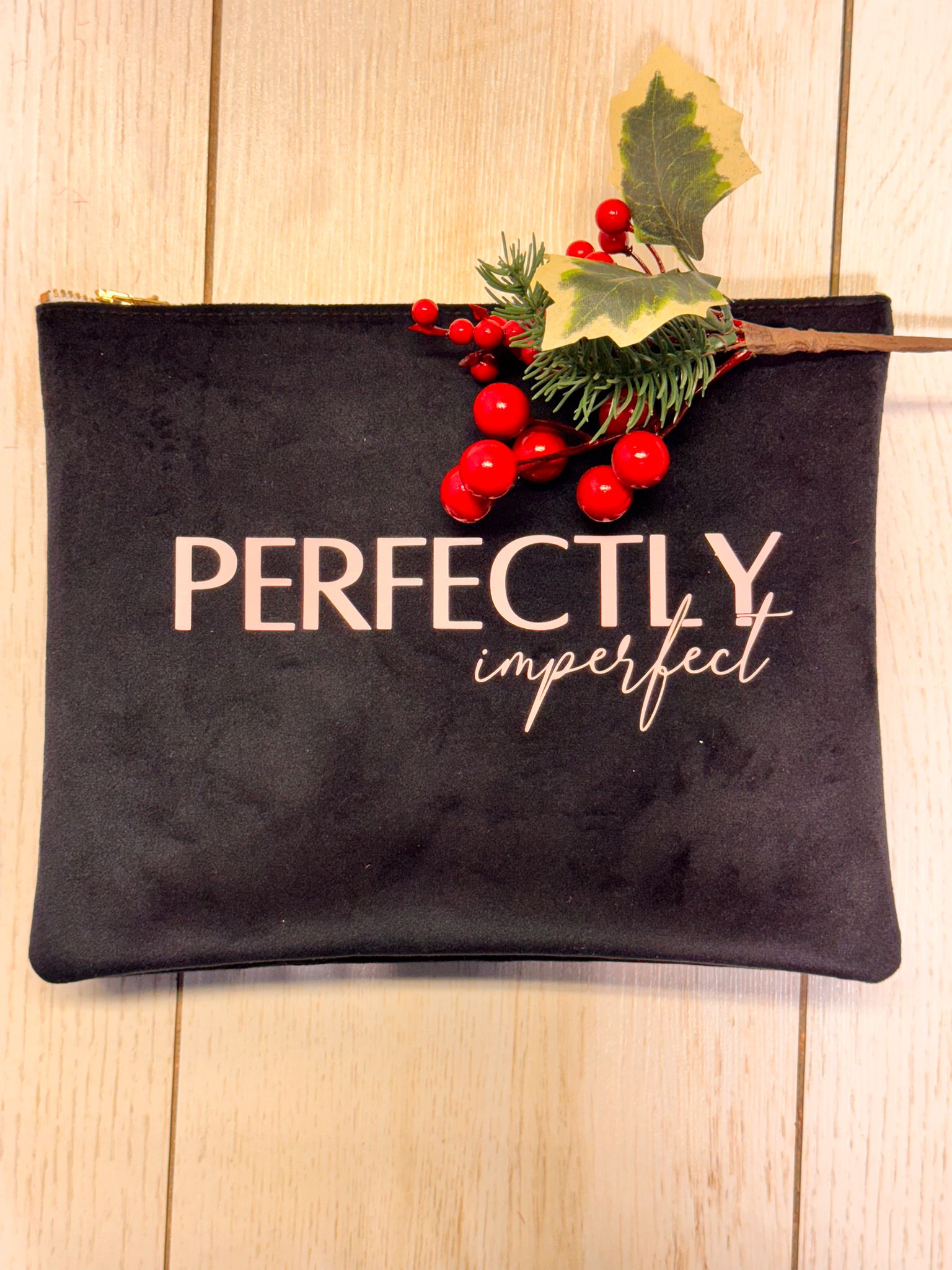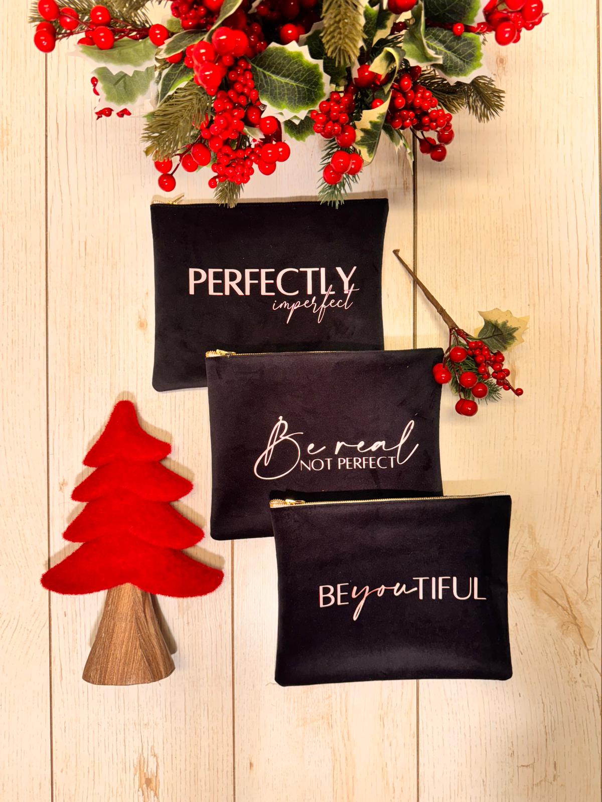 Borsetta in velluto colore nero, interno in ecopelle con stampa color rose gold. made in italy. misura 25x20 cerniera oro. 3 varianti di testo