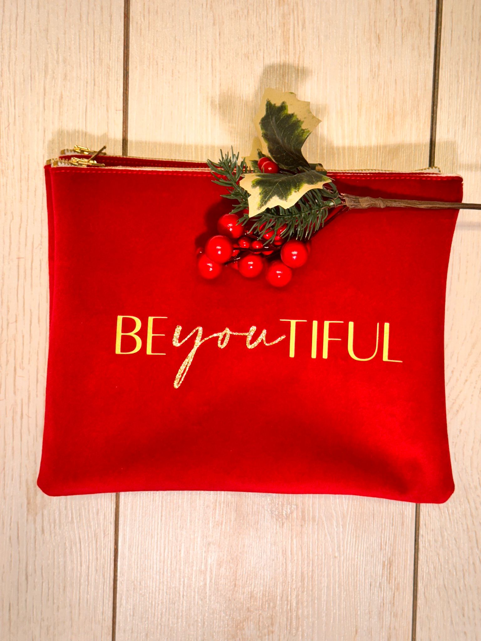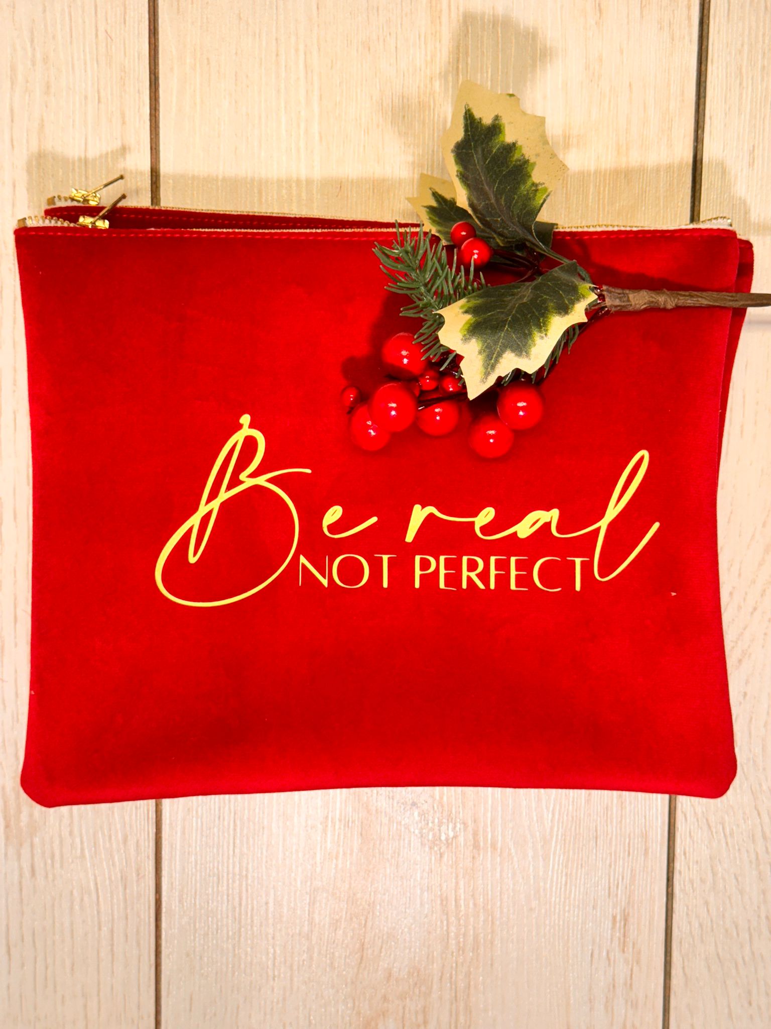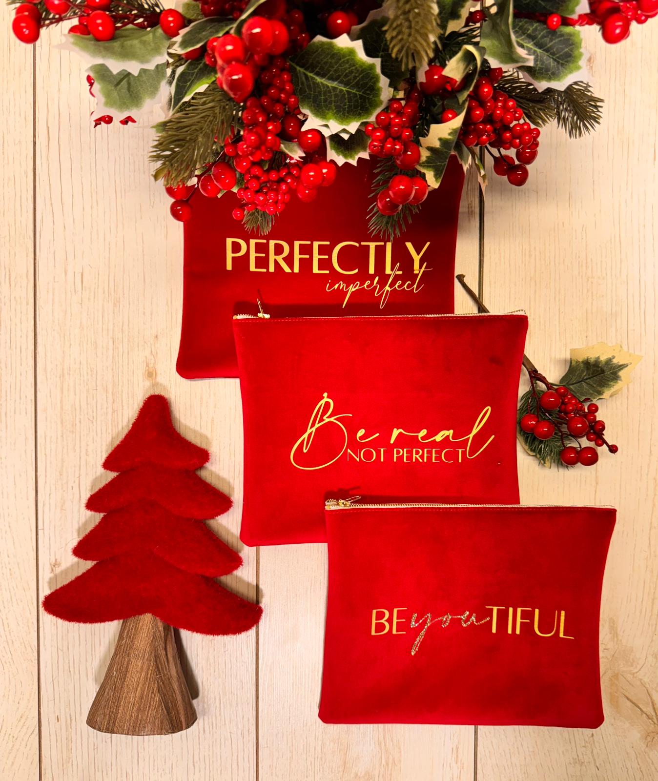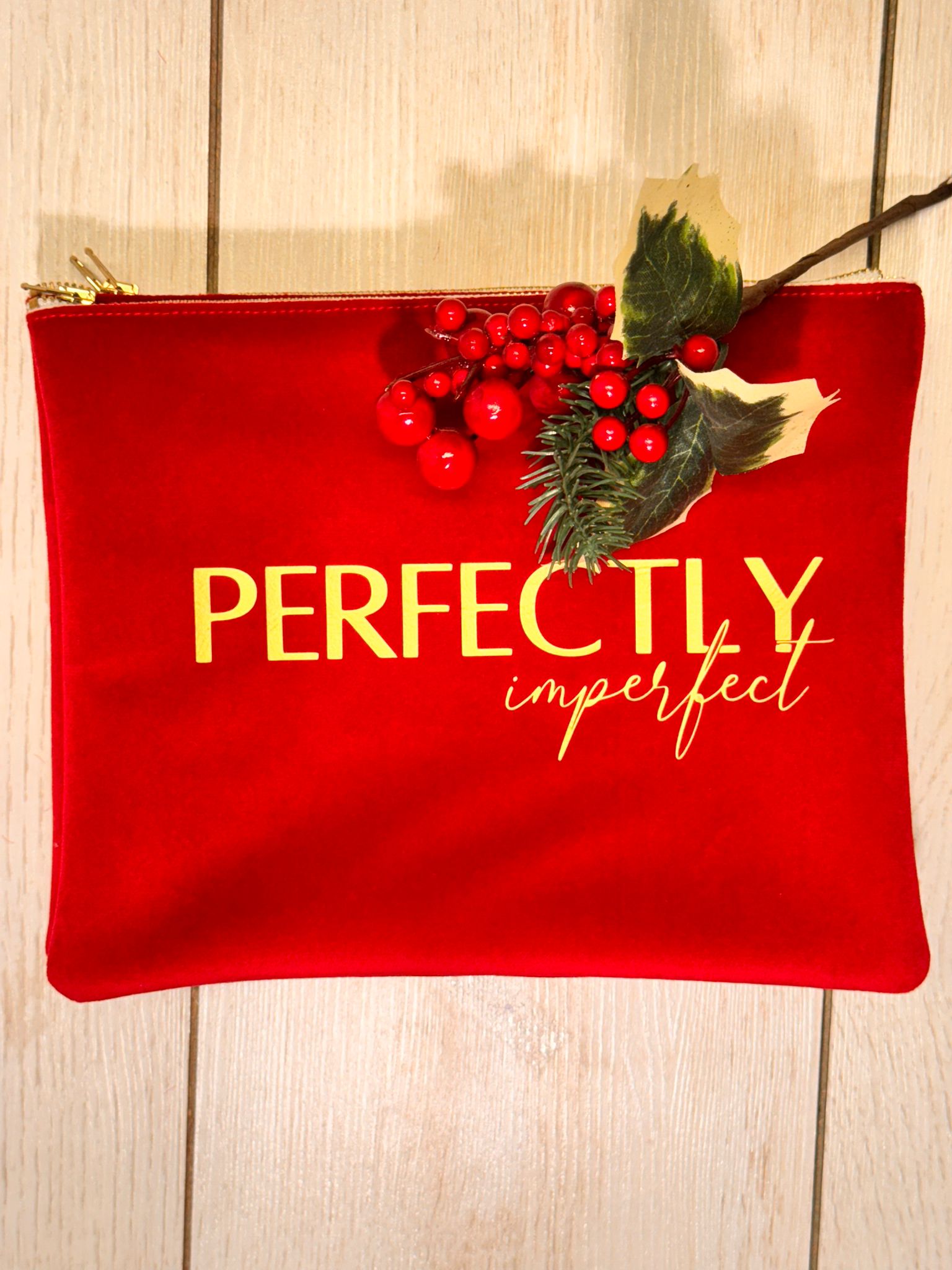 Borsetta in velluto color rosso, interno in ecopelle con stampa color oro. made in italy. misura 25x20 cerniera oro. 3 varianti di testo